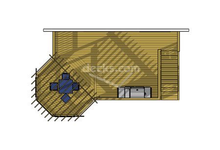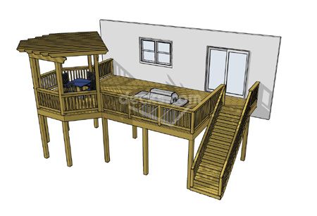 This deck design features a 12' x 12' octagon that is covered by an overhead pergola inset into a 26' x 14' base deck . A nice sized grill area is positioned across the front of the deck. A full length staircase extends away from the house from a landing located the edge of the deck.