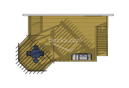 This deck design features a 12' x 12' octagon that is covered by an overhead pergola inset into a 28' x 16' base deck . A nice sized grill area is positioned across the front of the deck. A full length staircase extends away from the house from a landing located the edge of the deck.