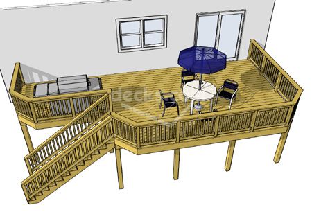 This is a very popular 2nd story deck design. It features a compact plan with a 30' x 14' primary area perfect for entertaining as well as a 10' x 8' secondary area for grilling.