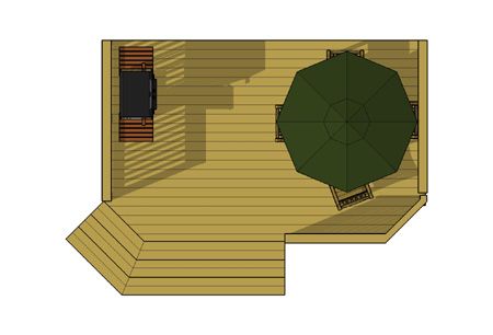 This basic deck design is a 16' x 10' deck with clipped corners. Cascading stairs wrap around the angled front rim to add a creative flare. A short privacy wall is included opposite the stairs as a contrasting element. A simple yet functional design. Great for grilling and relaxing. Easy and inexpensive to build.