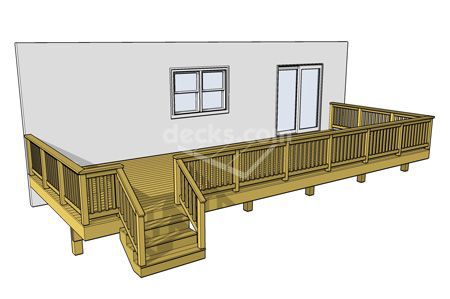 This basic 1 level 32' x 12' deck is an easy to build and economical choice. You may reposition the stairs and adjust the deck height to suit your needs.
