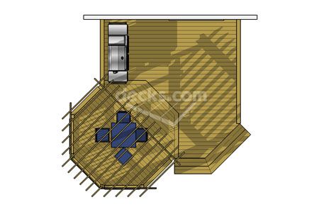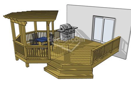This deck design features a 12' x 12' octagon that is covered by an overhead pergola inset into a 16' x 16' base deck . A nice sized grill area is positioned between the octagon and the house. The opposite half of the deck is neatly wrapped by a cascading staircase creating a broad traffic lane between the house and yard.