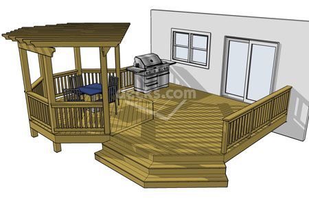 This deck design features a 12' x 12' octagon that is covered by an overhead pergola inset into a 18' x 16' base deck . A nice sized grill area is positioned between the octagon and the house. The opposite half of the deck is neatly wrapped by a cascading staircase creating a broad traffic lane between the house and yard.
