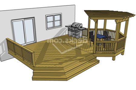 This deck design features a 12' x 12' octagon that is covered by an overhead pergola inset into a 22' x 16' base deck . A nice sized grill area is positioned between the octagon and the house. The opposite half of the deck is neatly wrapped by a cascading staircase creating a broad traffic lane between the house and yard.