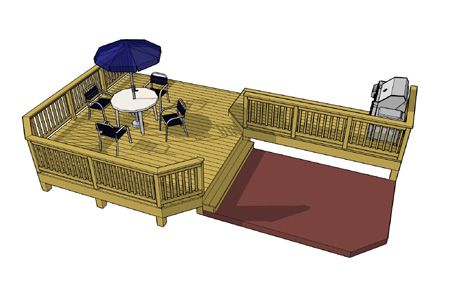 This 2 level deck uses overlapping planar forms in an interesting L-shape to facilitate a connection to a ground level patio or landscape feature. The 14' x 16' bottom deck is the perfect size for entertaining. The 12' x 6' top deck provides access to the house and a grilling area. This design emphasizes convenient direct access between the house and yard while preserving open spaces for deck uses.