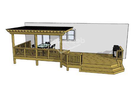 This 2 level deck features a 16' x 12' top deck completely covered by a decorative pergola. The 18' x 14' bottom deck design casually introduces a grilling area and stepped back cascading stairs into the fold. Notice how the stairs create a formal and inviting entrance that is neatly positioned within the deck frame. This plan comes with a pergola and house attachment detail.