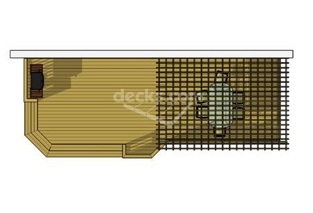 This deck design features a 12' x 12' octagon that is covered by an overhead pergola inset into a 16' x 12' base deck......