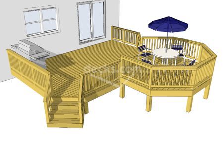 This 2 level deck is extremely functional. A 21' x 14' multi-purpose deck opens up to a short diagonal staircase and wraps around 2 sides of an elevated 12' x 12' octagon deck perfect for entertaining. This plan allows you to achieve a variety of design objectives with very little square footage.
